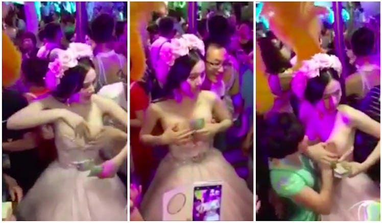 Apparently, this Chinese bride needed money so bad, she let guests touch her boobs in exchange for cold, hard cash.