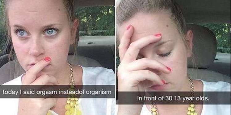 It's true. A teaching nightmare became a reality for a middle school science teacher, whose screenshots of her mortified Snapchat were posted to Imgur on Sunday, admitting her language malfunction.