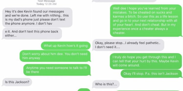 The conversation starts off with the girl, apparently named Dee, texting a message to whom she thinks is the guy she cheated on her ex with, Jackson.