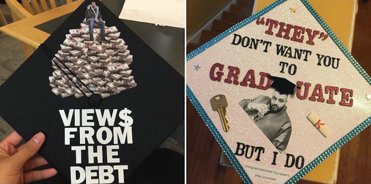 This must be the year of the SpongeBob, Drake or DJ Khaled graduation caps, or it's the year to protest student loans, because a surprising number of caps jokingly referenced graduation debt in some way, shape or form.