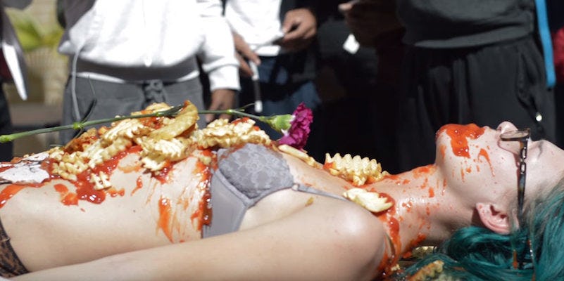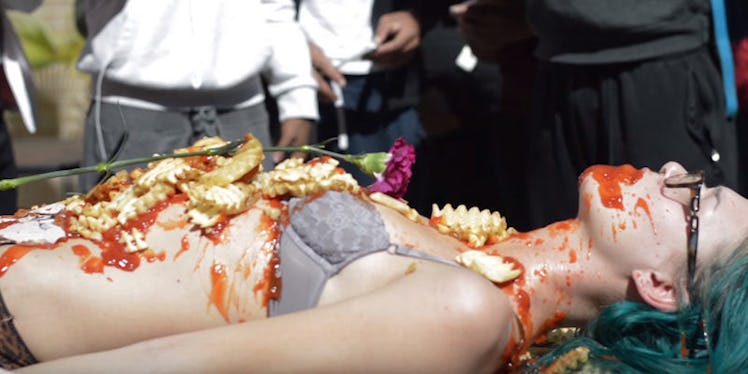 Covering her body in fast food, however, drew in more male students. Not a single woman ate the food displayed on her body.