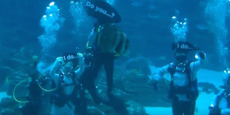 That's right. Instead of getting married on dry land, this adventurous couple decided to ditch the normal ceremony and take their love to new depths by getting married amid onlooking friends, family and... a bunch of sea creatures!