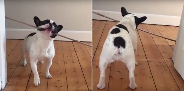 An often-attributed Albert Einstein quote (whether correctly or not) says "insanity is doing the same thing over and over again and expecting different results." Well, this French Bulldog trying to get a stick through a door is insane, but it's also cute and perseverant AF while doing it.