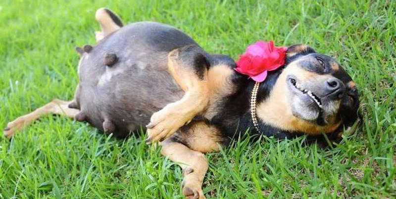 The shoot, posted to Imgur, features the brown and black pup displaying her round belly in all its maternal glory. If it sounds ridiculous, it is — but that doesn't make it any less adorable.
