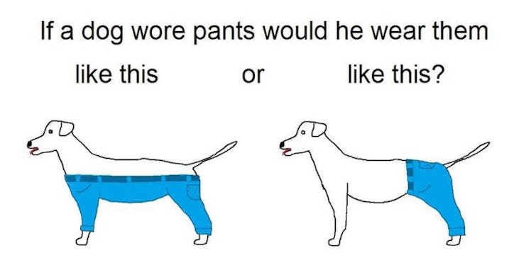 If, and only if, a dog finds a pair of pants it feels confident in and is able to wiggle into, we as humans should live and let pants.