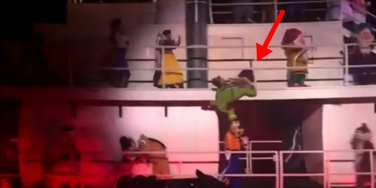 The video above captured by an onlooker shows Dopey taking a tumble between the railings. Fortunately, the clumsy character's fall was broken, and he escaped getting completely defenestrated from the boat.