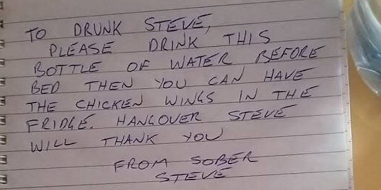 To drunk Steve, please drink this bottle of water before bed then you can have the chicken wings in the fridge. Hangover Steve will thank you. From sober Steve