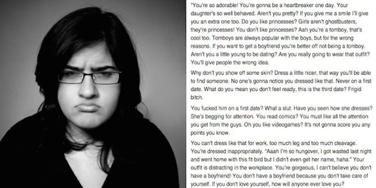 Why don't you show off some skin? Dress a little nicer, that way you'll be able to find someone. No one's gonna notice you dressed like that. Never on a first date. What do you mean you don't feel ready, this is the third date? Frigid bitch. You f*cked him on a first date? What a slut. Have you seen how she dresses? She's begging for attention.