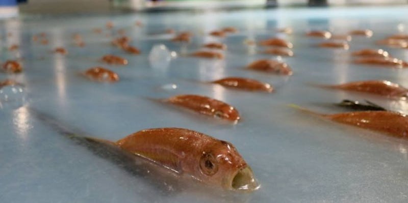 He said the fish were bought at a local market and were dead before being frozen into the ice rink.
