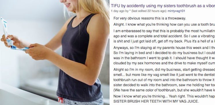 A Reddit user by the name "mintyvag101" wrote a post in the "Today, I Fucked Up" thread titled: "TIFU by accidentally using my sister's toothbrush as a vibrator."
