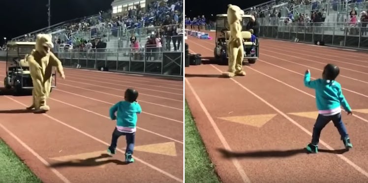 Once the adorable dance party was over, Anessah runs over to the mascot for a big hug as the crowd cheers her on.
