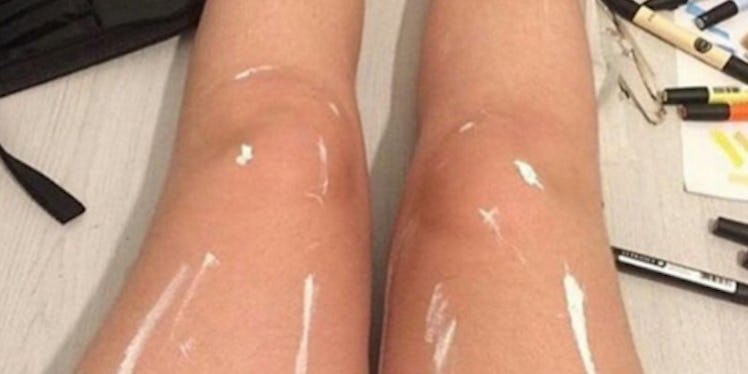 No, she definitely hasn't rolled two condoms up her legs, because that would look like two condoms, not paint.