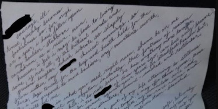 First, in terms of just trying to read the damn thing, it's borderline impossible. The guy chose to write the note in cursive, at a 45-degree angle, presumably in the name of ~art.~