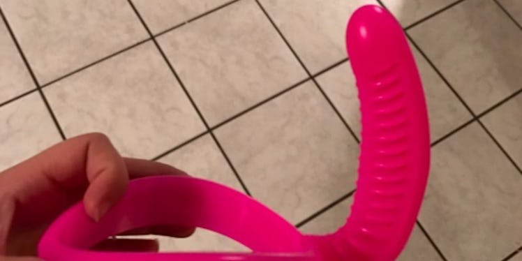 But as much as the fluorescent pink object looks like it should be sold at the local sex shop, it turns out it's simply a cup holder for Shelby's Yeti mug.