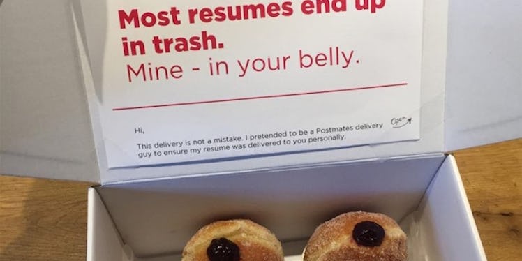 That's right. This creative genius hid his resume inside a box of delicious mini-doughnuts. He even dressed up as a Postmates courier so he could hand-deliver his sugar-coated credentials to the right person.