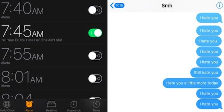 Not only that -- he literally set up an alarm under the label, "Tell Your Ex You Hate Her. She Ain't Shit," which, after it goes off at 7:45 am each morning, is exactly what he does. He tells her he hates her.