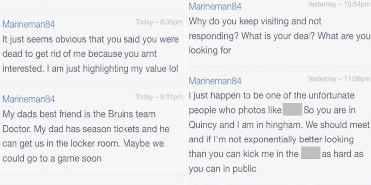 Boston resident pizzahutgurl snapped screenshots of the interaction and uploaded them to Tumblr under the username wefoundthesea, warning women of the creep's short fuse.