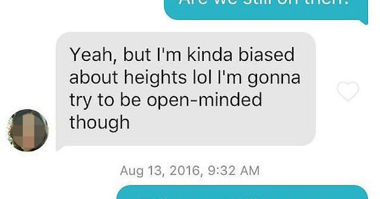 The girl (who already lost major points with that first comment) goes on to say, "I'm kinda biased about heights lol I'm gonna try to be open-minded though."