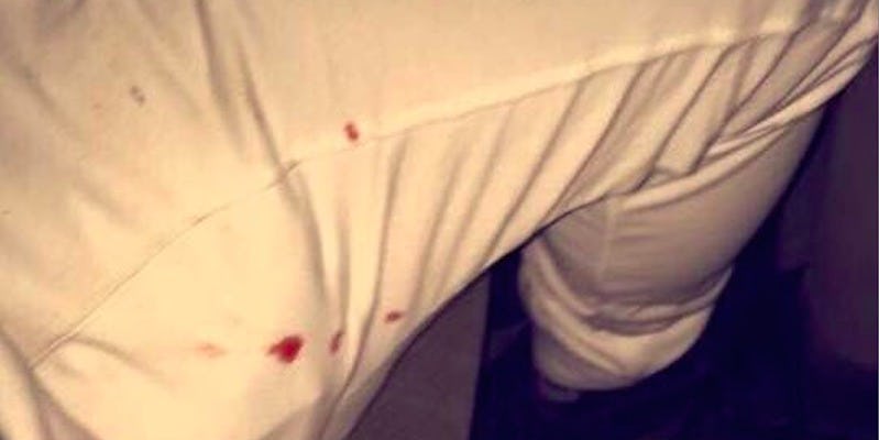 Yup, that just happened: He received a splattering of ruby love all over those crisp jeans. Also, what the hell are all those other mystery smears? He wrote,