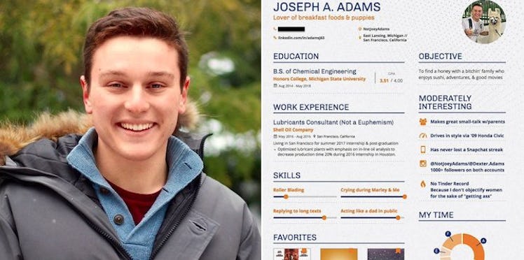 In the organized and incredibly detailed assessment of the eligible junior at Michigan State University, Adams' resume lists his work experience, skills, pastimes and just about everything else that would make a college girl swoon.