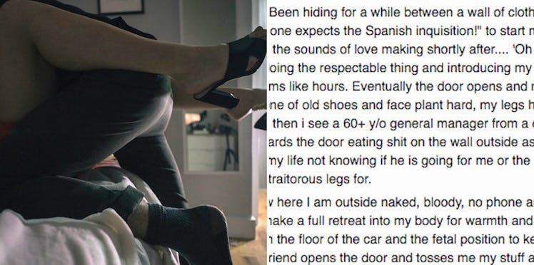 I lunge from my throne of old shoes and face plant hard, my legs have never been more asleep. I hear a voice from bed saying "babe what is going on" and then I see a 60+ y/o general manager from a different shift sit up and stare into my naked soul.