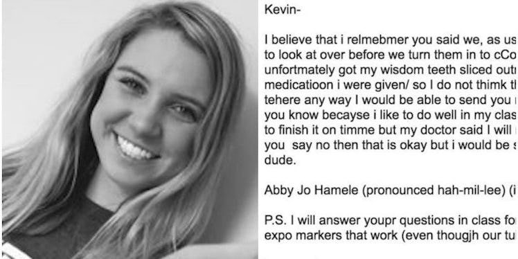 Abby Jo Hamele (pronounced hah-mil-lee -- inside joke) thought it was a good idea to get in touch with her teaching assistant shortly after getting her wisdom teeth out.