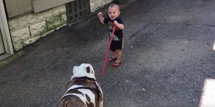 In the video above, an 11-month-old boy tries his hardest to walk the family’s 80-pound English bulldog.