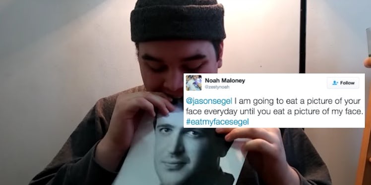 Noah Maloney, who has a YouTube channel called "Dog Shit," will only stop eating Jason Segel's face when the actor eats a picture of Noah's face in return.