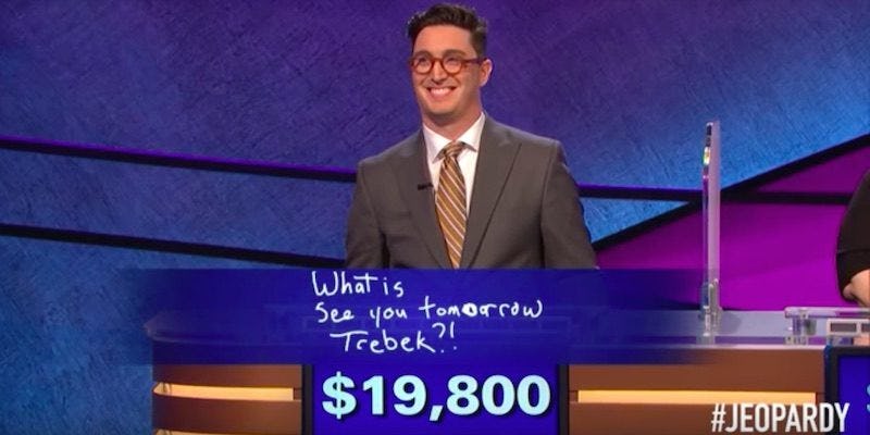 Yep, since Buzzy clearly isn't worried about anyone touching his insane lead, he's been having some fun with the final rounds by trolling the show's host and giving him smartass answers like,