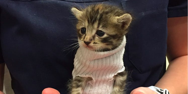The adorable feline in question was rescued from the storm and brought to a Petsmart in Raleigh, North Carolina in a sweater made out of a friggin' sock.