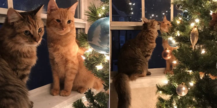 While admiring the Christmas lights on their Christmas tree, and possibly thinking of how they could destroy it together, the cats were captured on-camera in this sweet moment:
