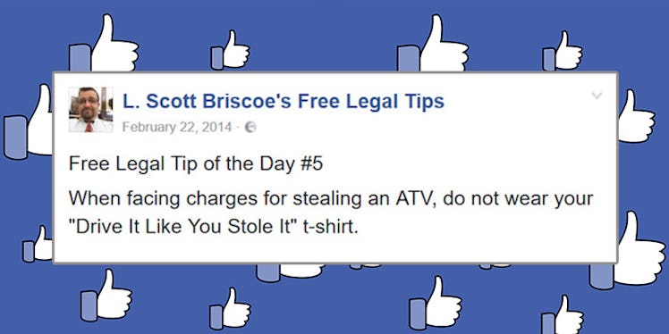 This clever lawyer also happens to have a sense of humor, so he shares all of the comical things he's learned in the courtroom over the years on his Facebook page, fittingly called "L. Scott Briscoe's Free Legal Tips."