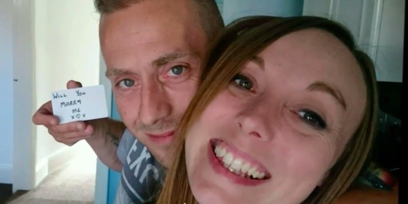 Over the course of six months, Smith took selfies with various hidden versions of "Will you marry me?" written on a card. On lucky number 149, Smith proposed to Bramley with an overt, verbal message. She said yes, of course.