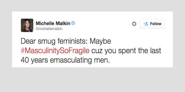 Dear smug feminists: Maybe #MasculinitySoFragile cuz you spent the last 40 years emasculating men. — Michelle Malkin (@michellemalkin) September 23, 2015