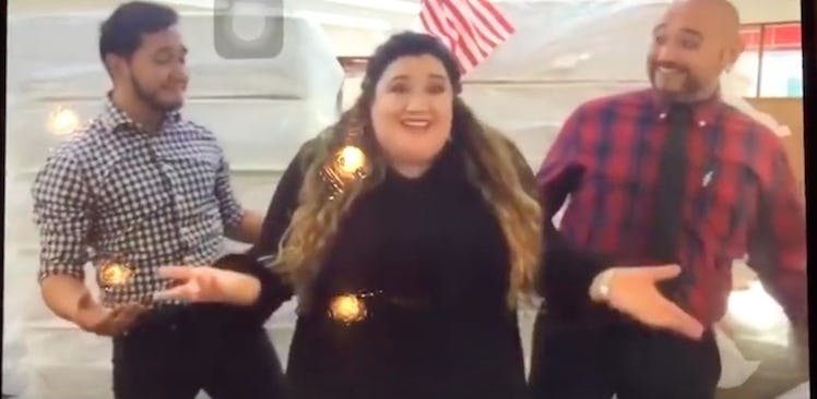 The video caused a huge stir on Facebook, as the owner's daughter, Cherise Bonnano, plugged a sale before pushing over two men and two stacks of mattresses.