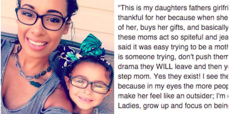 This is my daughter's father's girlfriend. The sweetest thing ever! I'm super thankful for her because when she visits her dad she feeds her, takes care of her, buys her gifts, and basically takes care of her like her own. Why do all these moms act so spiteful and jealous towards the other women? NO ONE said it was easy trying to be a mother to a kid you didn't have. So when there is someone trying, don't push them away! Because they DON'T need the drama they WILL leave and then you're stuck with someone who is the evil step mom.