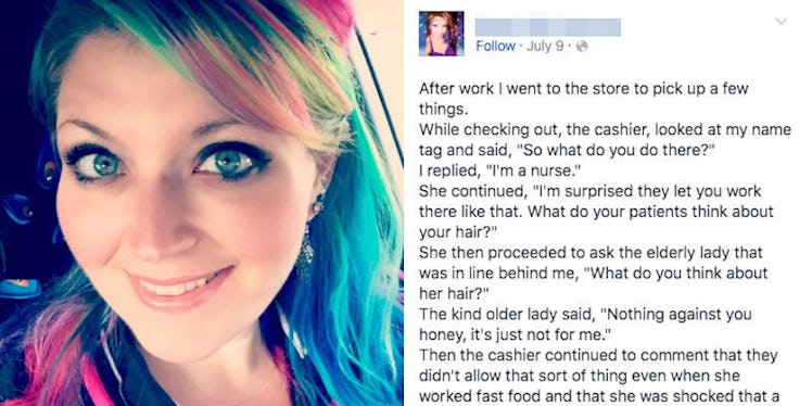 She made a pit stop at a convenience store after work, when the cashier said she was surprised Mary's bold hair color was allowed at the hospital.