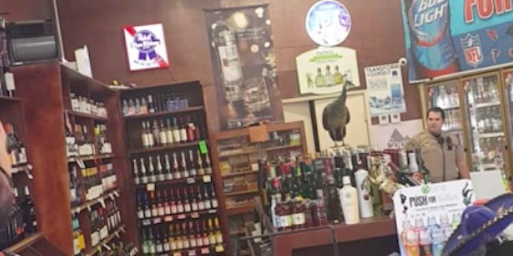 It's safe to say the seemingly thirsty bird didn't want to leave the liquor store, and we definitely can't blame her.