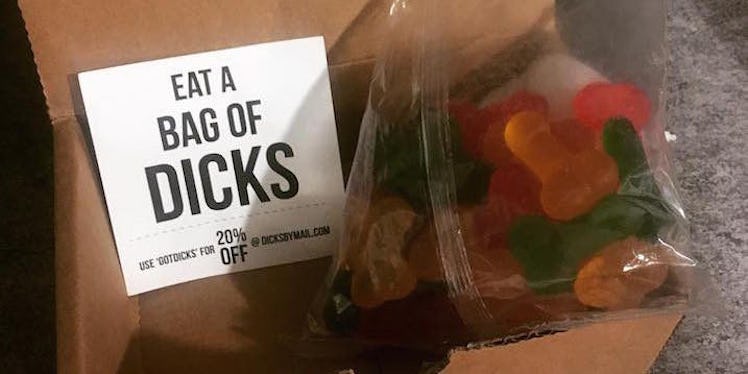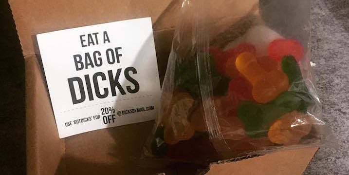Upon opening the package, the unlucky recipient will find a big ol' bag of penis gummies, along with a note that reads, "EAT A BAG OF DICKS!"