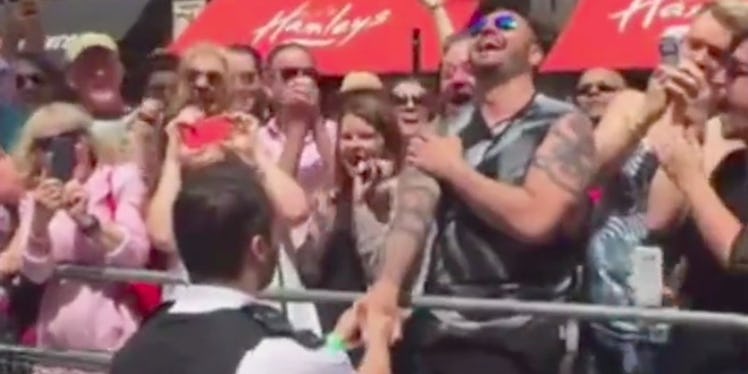 As police officers marched through the city for the parade, one policeman broke off to seek out his boyfriend in the crowd and propose to him.
