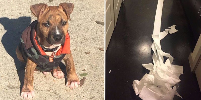 He realized his precious pup had tried to clean up the pee himself, by pulling tissue paper from the roll over to the wet spot.