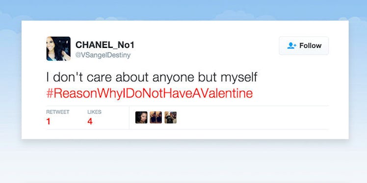 Thanks to the #ReasonWhyIDoNotHaveAValentine hashtag, Twitter is fighting back against this expectation and building a community of people who not only have nothing to do on Valentine's Day, but are also PROUD to embrace their singleness.