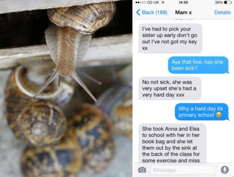 My little sister took her pet snails to school ffs me and my mum are howling.