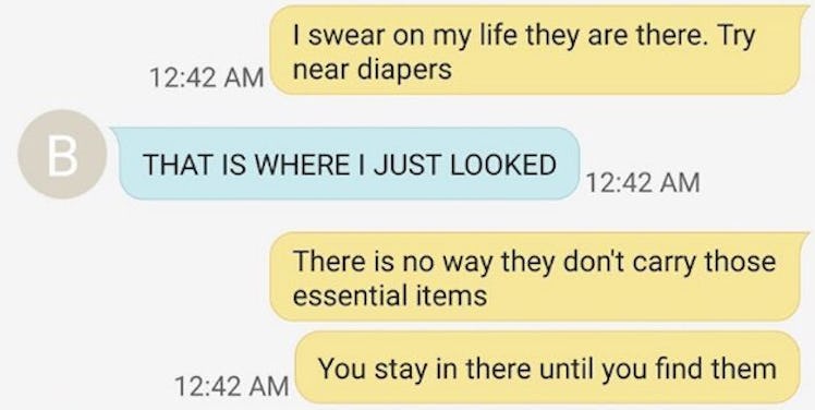 "THEYRE NOT HERRREEEEEE," she messaged, "EVERYTHING IS HERE EXCEPT WHAT I NEED."