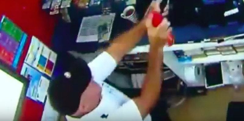 Security footage from the shop shows Rigney's brilliant attack. Take a peek below (and, you know, don't try this at home).
