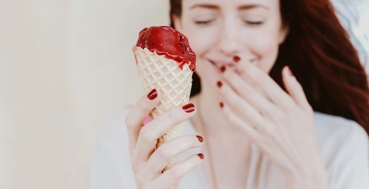 Twitter user @alinamarie____, who is named on the social media site as "queen of extra," kickstarted the mani trend that others are trying to emulate. Rather than simply post a photo of her new mani, she gave a little something extra. Alina's pink hue reminded her of some food, so she found herself a slice of ham and pink slushie that perfectly capture the millennial pink vibe she had going with her mani.