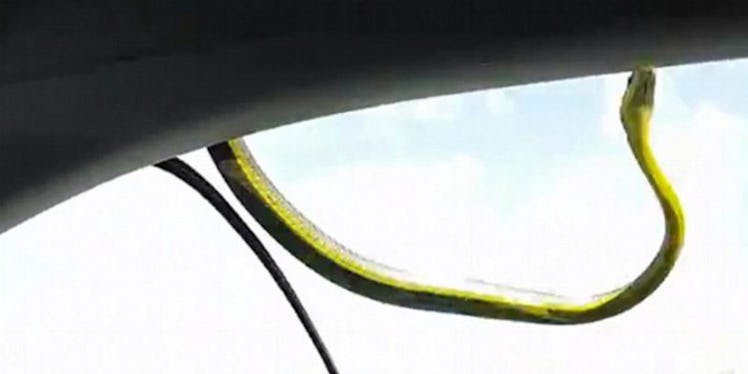 Honestly, the video really bums me out. It looks like a harmless tree snake -- the couple certainly should have pulled over and let him get off.