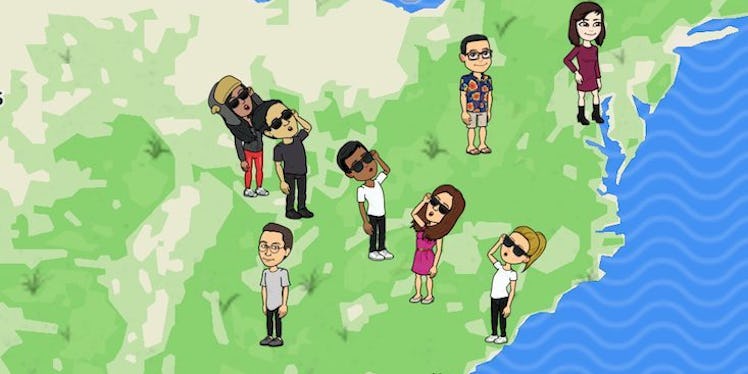 Just in case you didn't hear the news (LOL), there's going to be a solar eclipse on Aug. 21. The moon is preparing to throw some serious shade, and in the meantime, you've been flooded with constant reminders about your behavior, your pets' behavior, and your weekly horoscope. Everything — even sweet treats and cocktails — is getting the eclipse treatment. So it comes as no surprise that social media platforms like Snapchat are getting in on the hype. Your Snap alter ego can stay safe during the event, as Snap Map bitmojis with sunglasses during the eclipse are here to protect your eyes while you take in the views.