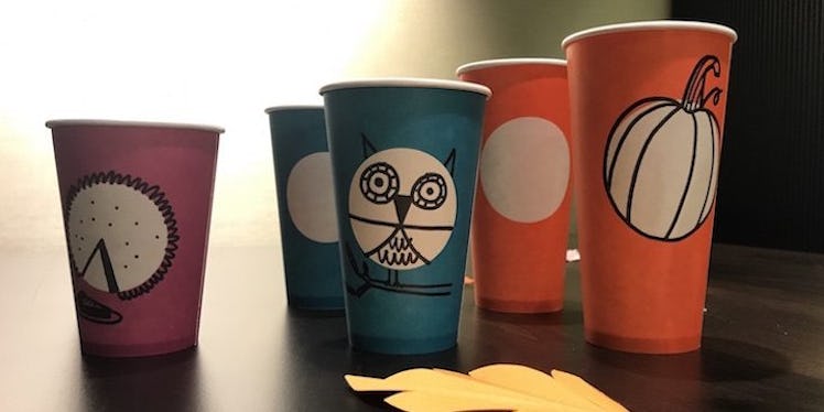 On Thursday, Sept. 21, Starbucks announced its new fall drink — the Maple Pecan Latte — as well as another super exciting addition to our morning routines: New. Fall. Cups. Just like the Spring Cups released earlier in 2017, the jewel-toned fall versions are made to feature your best autumnal doodles. A Starbucks spokesperson tells Elite Daily that, while some will come pre-doodled with illustrations (either a pie, an owl, or a pumpkin), some cups will be ready for customers to customize, featuring a blank white circle in the middle. Scroll on to see photos of Starbucks' fall cups that will make you say, "Is it Halloween yet?"