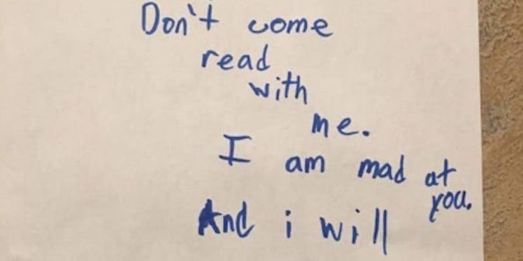 Mommy, Don't come read with me. I am mad at you. And I will tuck my own self in. Sinserly, Owen.